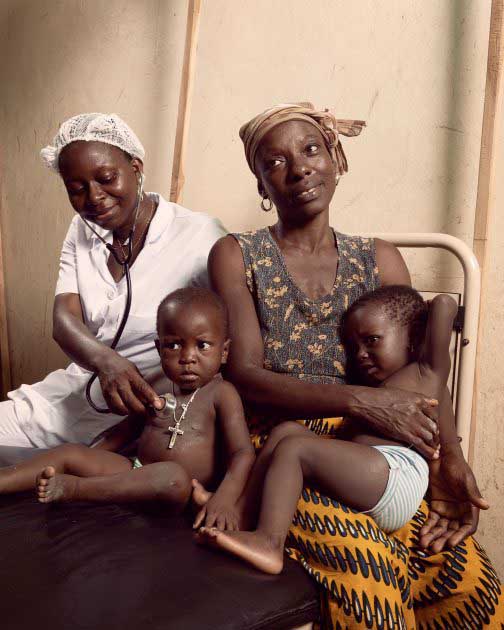 Arielle Agrokannoun (left), a nurse in the health center at Athiémé, a city of 40,000 people 100 kilometers from Cotonou, the capital of Benin, examines an 18-month-old boy whose mother has just given birth to another child. His grandmother (right), Marie Adbassou, 37, holds her own youngest child, age 2. In this health center, malaria is the most common illness among children.