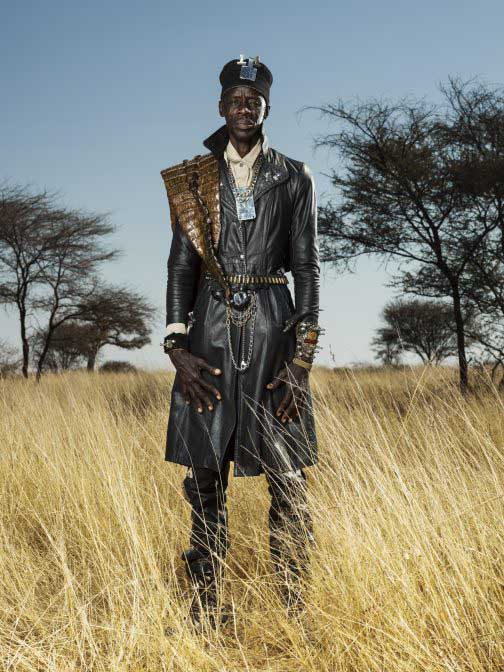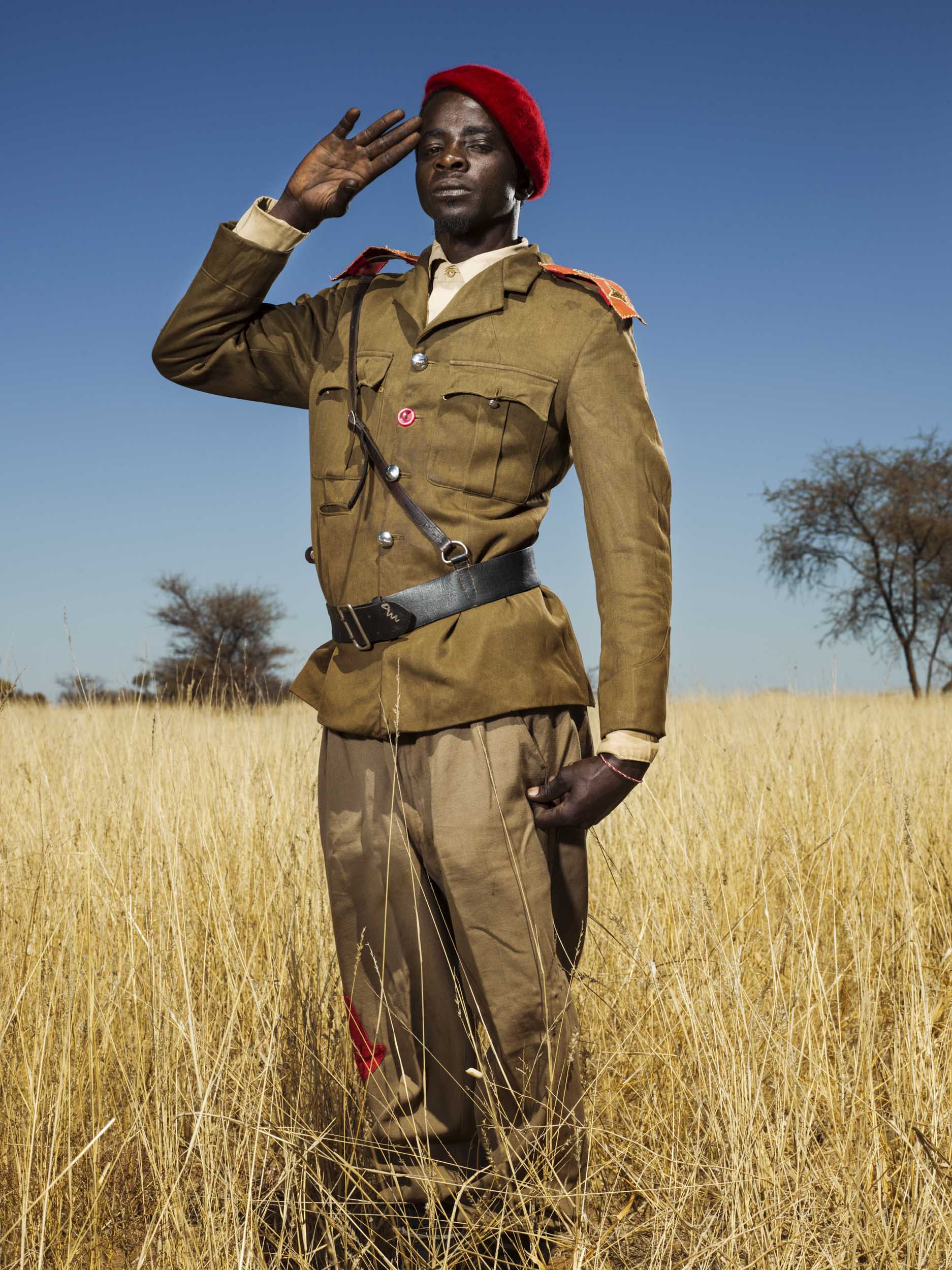 Raphael Mbongarero Ngueza from Omaruru pose in a field, his uniform is very surprising as it's a copy of a german SS uniform. Raphael want to show the link between Herero genocide and the Holocaust.