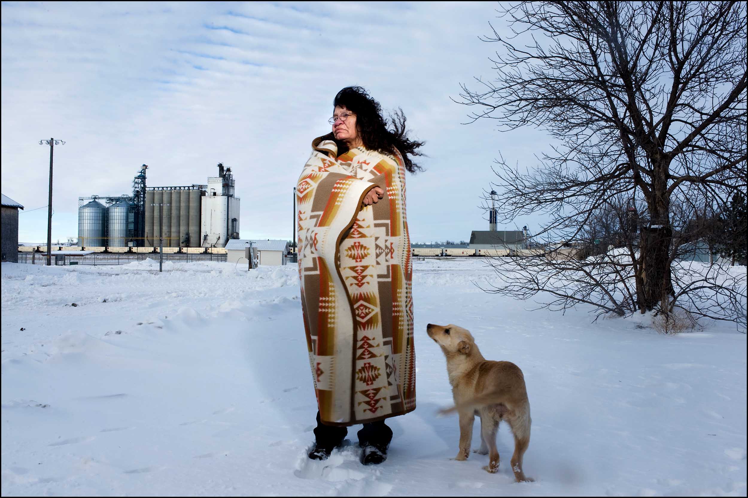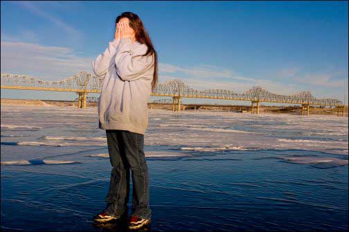 Yvette Cameron, who was raped by a white man three years ago, stands on the frozen Missouri river in front of a bridge which marks the border between Indian country and the white world, on 2009. In the territory of legendary Sioux warrior